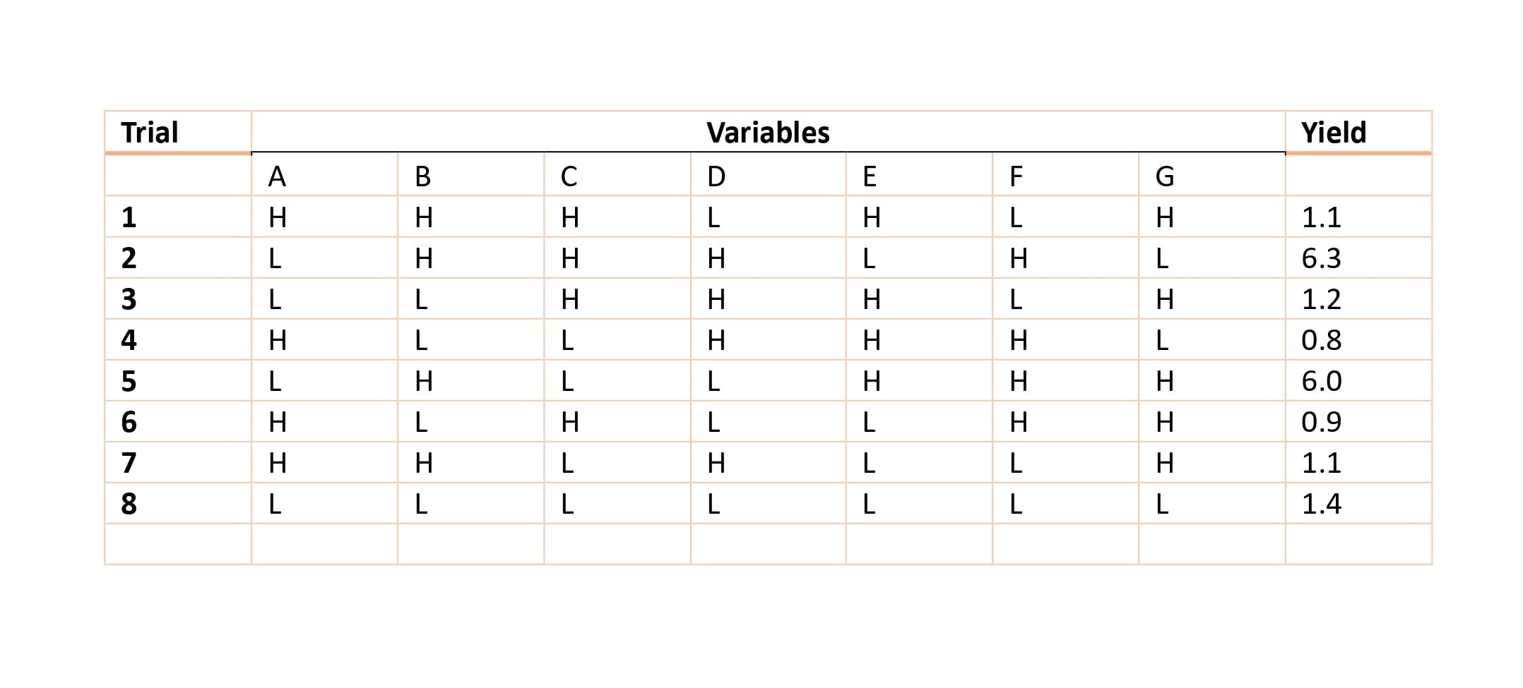- Each horizontal row represents a trial and each vertical column represents the H (high) and L (low) values of one variable in all the trials.