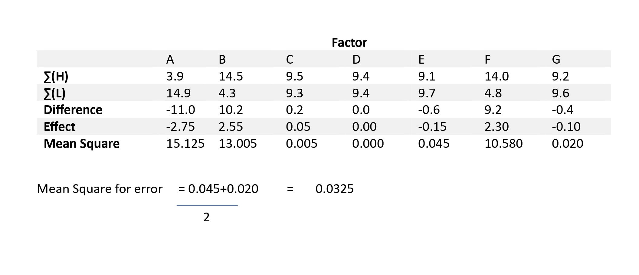 The experimental error can be calculated by averaging the mean squares of the dummy effects of E and G.